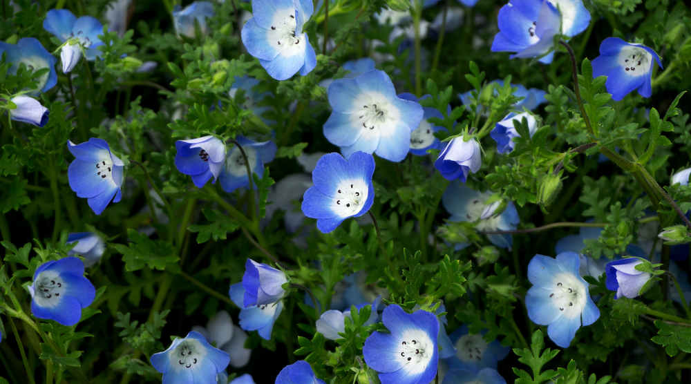 Baby blue eyes (Nemophila menziesii), is a flowering plant native to California and the Pacific Northwest. This annual plant is part of the Boraginaceae family and is recognized for its delicate, bright blue flowers that bloom in spring. The plant typically grows to a height of 6 to 12 inches and features lobed, green leaves that provide a lush backdrop for its striking blooms.
